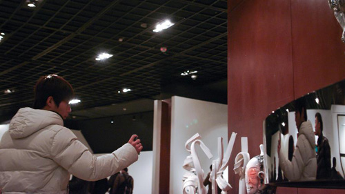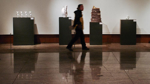 A visitor walks past the exhibits at the 1st China Contemporary Ceramics Art Exhibition at Beijing World Art Museum of the China Millennium Monument, in Beijing, capital of China, Dec. 5, 2012. The exhibition, which opened on Wednesday, will last until Dec. 11.
