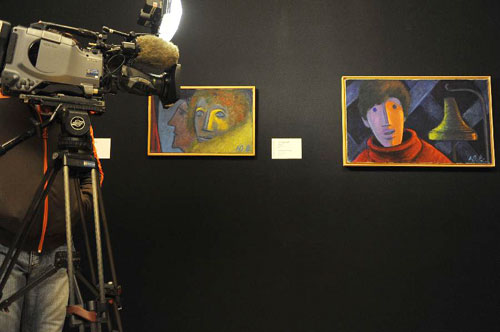 A reporter makes videos at the exhibition "Werner Berg: from Expressionism to Pop Art" in Beijing, capital of China, Jan. 5, 2013. The exhibition, which was opened at the National Art Museum of China (NAMOC) on Saturday, displays more than 70 oil paintings and 16 woodcuts created by Austrian painter Werner Berg (1904-1981). (Xinhua/Lu Peng)