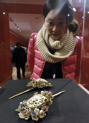 A visitor watches a pair of ancient golden hairpins during an exhibition of antiques of the 1573-1620 period at Suzhou Museum in Suzhou, east China's Jiangsu Province, Jan. 19, 2013. The exhibition, which showcases 108 antiques dating back to the 1573-1620 period, will last until April 14. (Xinhua/Wang Jiankang)