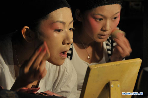 Performers put on makeup before the performance in Songmei Village of Lingao County, south China's Hainan Province, Feb. 14, 2013. A group of performers from Hainan Opera Theatre went on a ten-day tour performance in ten villages of Hainan Province. (Xinhua/Wei Hua)
