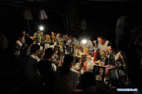 Performers put on makeup before the performance in Songmei Village of Lingao County, south China's Hainan Province, Feb. 14, 2013. A group of performers from Hainan Opera Theatre went on a ten-day tour performance in ten villages of Hainan Province. (Xinhua/Wei Hua)