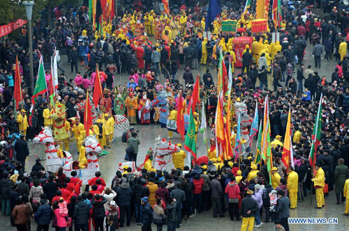 Visitors watch the performances during the 14th Folk Culture Festival in Liyang City, east China's Jiangsu Province, Feb. 17, 2013. (Xinhua/Han Yuqing)