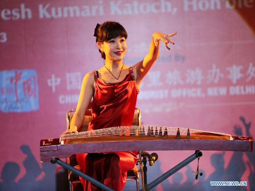 A Chinese artist plays Guzheng, a traditional Chinese stringed instrument, during the "Chinese Spring Festival 2013" at FICCI Auditorium in New Delhi, India, Feb. 25, 2013. The Chinese Embassy to India and the India China Economic and Cultural Council organized the "Chinese Spring Festival 2013" Monday to showcase Chinese music, dance, and martial art. (Xinhua/Li Yigang)