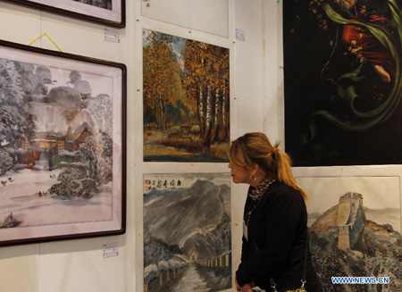 A visitor watches artworks by Chinese artists in New York City, the United States, on March 21, 2013, during the New York Art Expo which is the world's largest fine art trade show for 35 years.