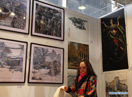 Chinese artist Chen Yanmei sorts out her artworks in New York City, the United States, on March 21, 2013, during the New York Art Expo which is the world's largest fine art trade show for 35 years.