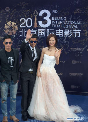 Actors Cheung Ka Fai (L), Aaron Kwok (C) and actress Jiang Yiyan attend the closing ceremony of the 2013 Beijing International Film Festival in Beijing, capital of China, April 23, 2013. The festival closed on Tuesday. (Xinhua/Zhang Yu)