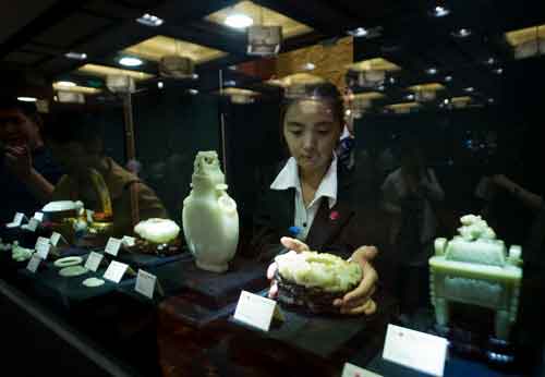 An exhibitor arranges a jade work during the preview of China Guardian 2013 Spring Auctions in Beijing, capital of China, May 7, 2013. The three-day preview that opened on Tuesday displayed some 3,900 treasures to be auctioned on Friday. (Xinhua/Luo Xiaoguang)