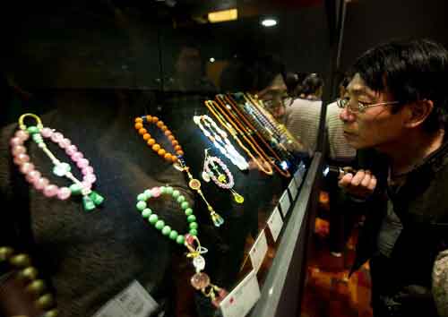 A man looks at jewellries during the preview of China Guardian 2013 Spring Auctions in Beijing, capital of China, May 7, 2013. The three-day preview that opened on Tuesday displayed some 3,900 treasures to be auctioned on Friday. (Xinhua/Luo Xiaoguang)