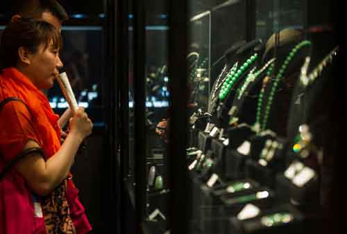 A woman looks at jewellries during the preview of China Guardian 2013 Spring Auctions in Beijing, capital of China, May 7, 2013. The three-day preview that opened on Tuesday displayed some 3,900 treasures to be auctioned on Friday. (Xinhua/Luo Xiaoguang)