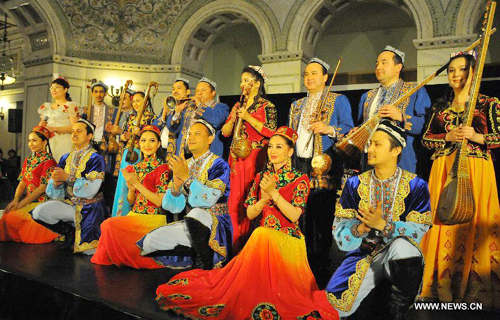 Members of China's Xinjiang Tarim Performing Troupe pose for a group photo after their performance in Chicago, the United States, May 14, 2013. The 18-member troupe concluded their one-month tour in five states in the US, presenting a total of 35 shows. [Photo/Xinhua]