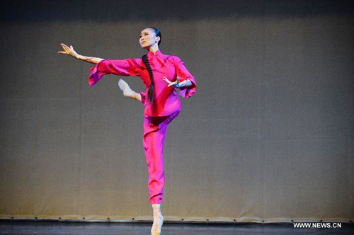 An actress of the National Ballet of China performs at the Beijing Institute of Fashion Technology in Beijing, capital of China, May 14, 2013. The performance was part of the activity of "introducing high arts to schools", which was started in 2006 and was aimed at improving the aesthetic faculties of the young. [Photo/Xinhua]