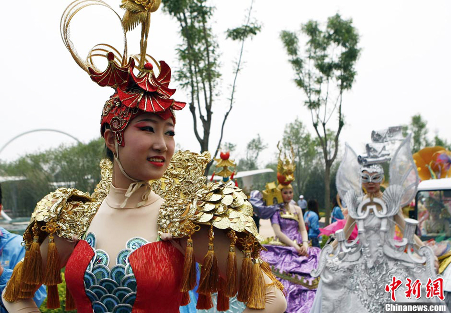 A model presents "The Palace Museum" landscape costume at the opening ceremony of the 9th China (Beijing) International Garden Expo in Fengtai District, Beijing, May 18, 2013. (CNS/Li Huisi)