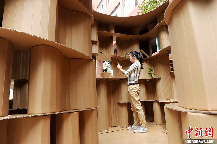 A student takes photos inside a house made of paper boxes at Chongqing University in Southwest China's Chongqing Municipality, May 20, 2013. (CNS/Chen Chao)