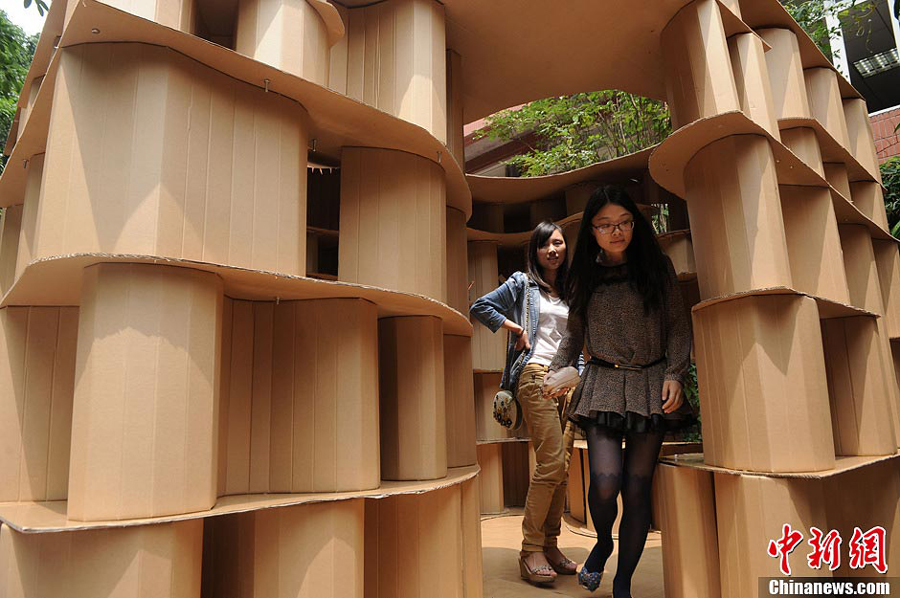 Students look a round a house made of paper boxes at Chongqing University in Southwest China's Chongqing Municipality, May 20, 2013. (CNS/Chen Chao)