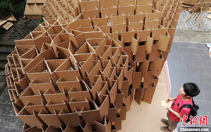 Students look a round a house made of paper boxes at Chongqing University in Southwest China's Chongqing Municipality, May 20, 2013. (CNS/Chen Chao)