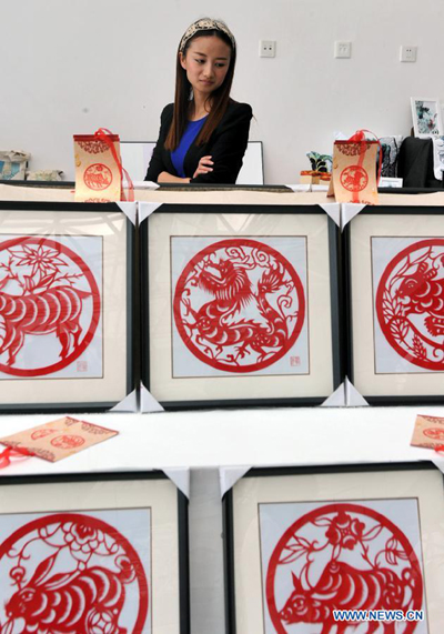 A visitor views paper-cuts on an exhibition showcasing graduation projects at the Yunnan Arts University (YAU) in Kunming, capital of south China's Yunnan Province, June 5, 2013. The exhibition was held by YAU's Wenhua College on Wednesday in order to draw employers' attention for recruiting their graduates. (Xinhua/Chen Haining)