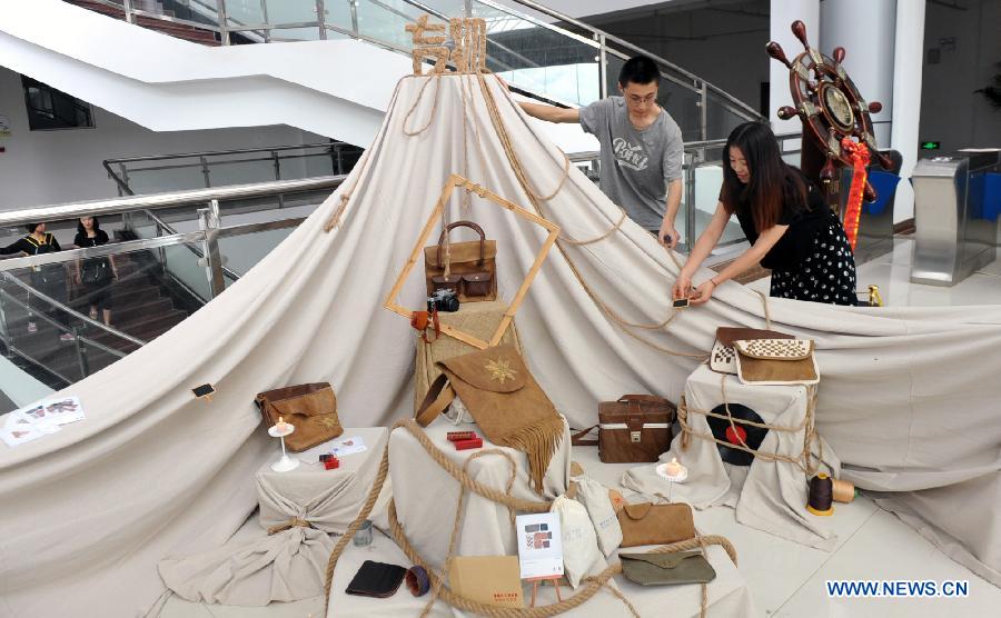 Graduates majoring in package and decoration design shows her creations on an exhibition showcasing graduation projects at the Yunnan Arts University (YAU) in Kunming, capital of south China's Yunnan Province, June 5, 2013. The exhibition was held by YAU's Wenhua College on Wednesday in order to draw employers' attention for recruiting their graduates. (Xinhua/Chen Haining)