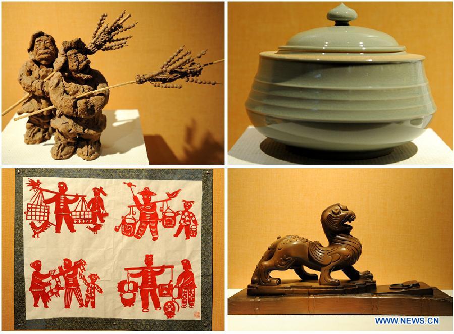 Combo photo taken on June 8, 2013 shows the artworks at an exhibition of intangible cultural heritages in the Henan Museum in Zhengzhou, capital of central China's Henan Province, June 8, 2013. The exhibition was held to mark the 8th National Cultural Heritage Day. (Xinhua/Li Bo)