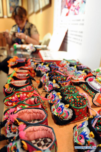 Photo taken on June 8, 2013 shows the traditional tiger shoes at an exhibition of intangible cultural heritages in the Henan Museum in Zhengzhou, capital of central China's Henan Province, June 8, 2013. The exhibition was held to mark the 8th National Cultural Heritage Day. (Xinhua/Li Bo)