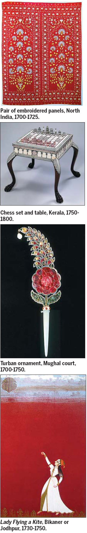 The third section, Beyond the Palace, focuses on Indian rulers' way of life outside the palace to show their ability to protect the people from external threats. The vision of a king riding a richly caparisoned elephant or horse was believed to be auspicious.