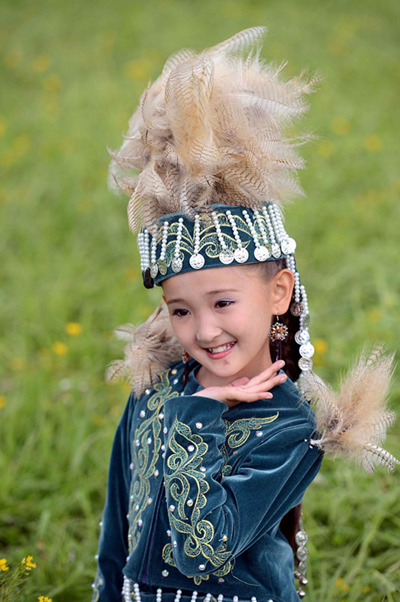 A well-dressed Kazak girl models her beautiful clothes at the 18th Aqin Aytis Fair, June 11,2013.[Photo/Xinhua]