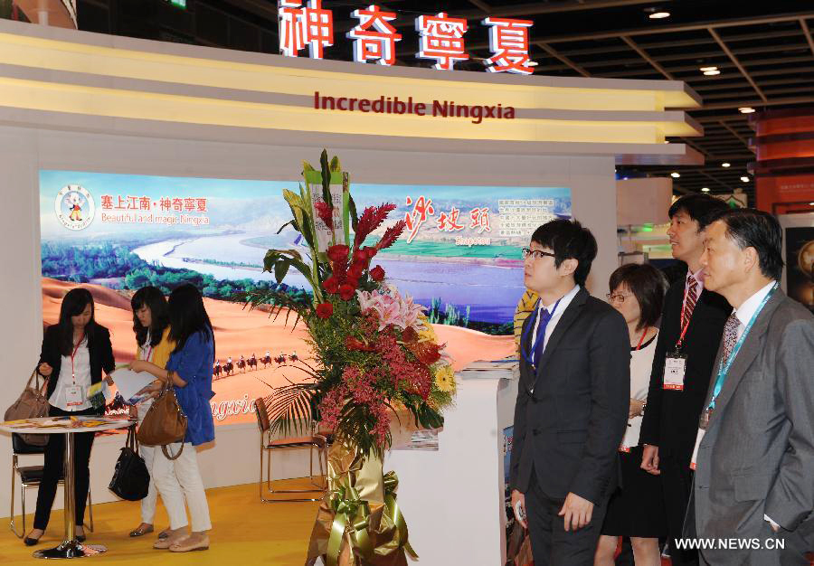 People walk past an exhibition stand of Northwest China's Ningxia Hui autonomous region at the 27th Hong Kong International Travel Expo in South China's Hong Kong, June 13, 2013. The four-day expo kicked off here on Thursday at Hong Kong Convention & Exhibition Centre. [Photo/Xinhua]