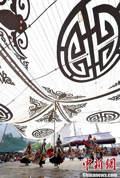 Lamas wearing masks perform "Qiang Mu" dance in Samye Monastery in Chanang County, Southwest China's Tibet Autonomous Region, June 24, 2013. "Qiang Mu," a religious dance of Tibetan Buddhism, is a well-established performing art form combining scripture chanting in perfect unison with music and dance, and performed in temples by lamas with solemn and splendid atmospheres. (CNS/Li Lin)