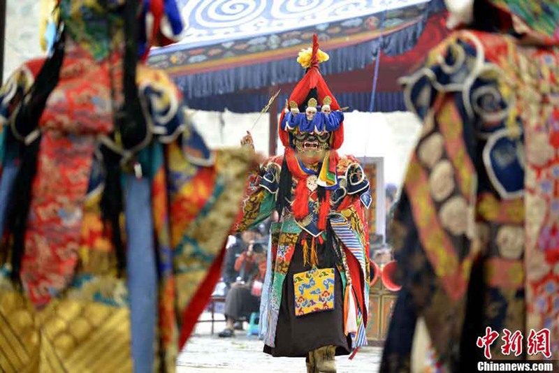 Lamas wearing masks perform "Qiang Mu" dance in Samye Monastery in Chanang County, Southwest China's Tibet Autonomous Region, June 24, 2013. "Qiang Mu," a religious dance of Tibetan Buddhism, is a well-established performing art form combining scripture chanting in perfect unison with music and dance, and performed in temples by lamas with solemn and splendid atmospheres. (CNS/Li Lin)