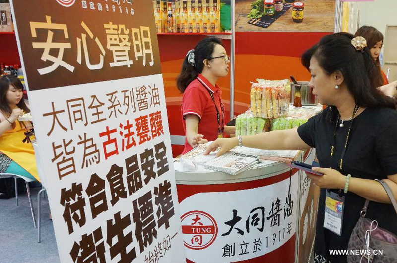 Visitors walk past a roll-up banner printed with an exhibitor's statement on food safety at Food Taipei 2013 exhibition in Taipei, southeast China's Taiwan, June 26, 2013. The four-day Food Taipei 2013 show kicked off Wednesday at Taipei World Trade Center Nangang Exhibition Hall. (Xinhua/Tao Ming)