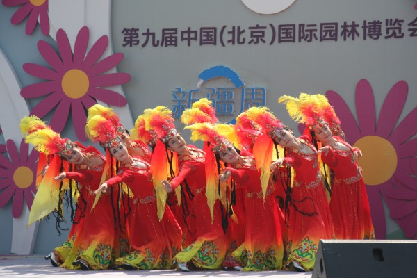Dancers from Xinjiang performing for Xinjiang Week, Crape Myrtle (Ziwei) Square, Beijing Garden Expo, on June 23. (chinadaily.com.cn)