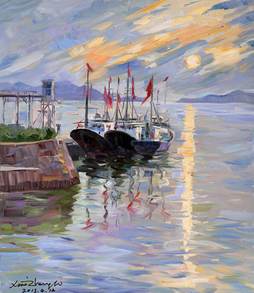"Sunset: Daxi'ao Village, Zhujiajian Town, Zhoushan City" (80cmX70cm), April 12, 2013. Chinese Australian oil painter Li Xiaozheng's new exhibition themed "Jiangnan Charm" opened on July 7 at the Roundness Art Gallery in Beijing's Songzhuang, the largest art zone in both China and the world. The exhibition features 28 artworks created by Li during his 34-day fieldtrip, between March and April of this year, to Jiangnan. (China.org.cn/Zhang Junmian)