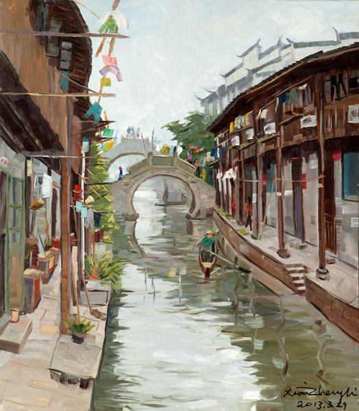 "Life on Water, Keqiao Ancient Town, Shaoxing City" (80cmX70cm), March 29, 2013. Chinese Australian oil painter Li Xiaozheng's new exhibition themed "Jiangnan Charm" opened on July 7 at the Roundness Art Gallery in Beijing's Songzhuang, the largest art zone in both China and the world. The exhibition features 28 artworks created by Li during his 34-day fieldtrip, between March and April of this year, to Jiangnan. (China.org.cn/Zhang Junmian)