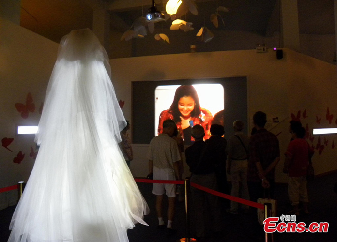 An exhibition displaying the albums, clothes and other belongings of late Taiwanese singer Teresa Teng in eastern China's Jiangsu province has attracted more than 20,000 visitors by July 9, 2013. Visitors watch a video record of Teng. [Photo: CNS/Huang Ying]