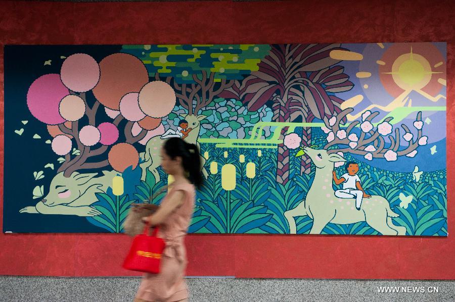 A woman walks past a wall painting in a subway routeway in Guangzhou, capital of south China's Guangdong province, July 11, 2013. An art exhibition displaying 32 wall paintings by 32 artists with environment-friendly paint was opened recently in the routeway of the Yuexiu Park Station of Guangzhou subway. These paintings will be auctioned to support art education in needy schools. [Xinhua/Mao Siqian]