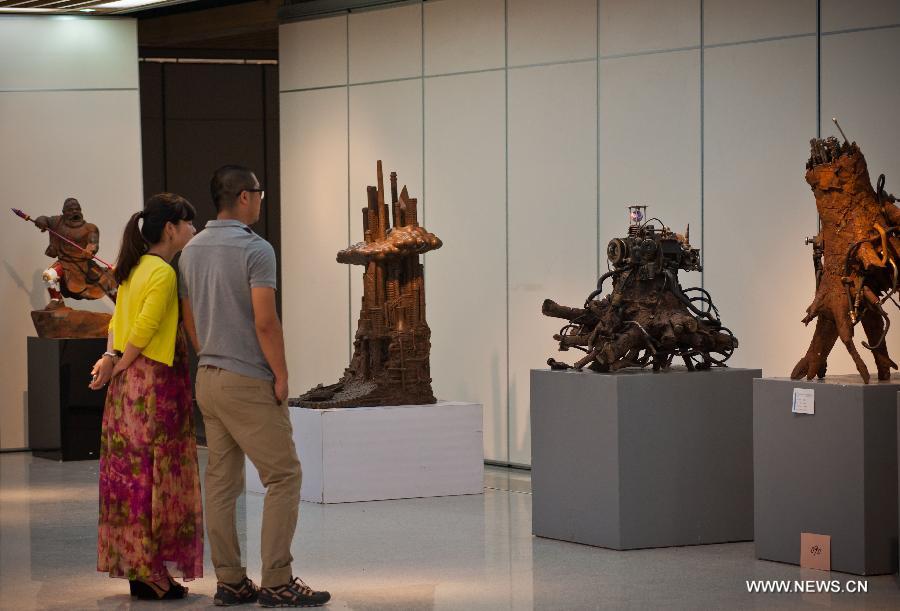 Visitors view sculptures displayed at an exhibition of excellent sculpture works of 2013 college graduates in Beijing, capital of China, July 13, 2013. Over 100 works submitted by art academies nationwide are presented to the public from Saturday on here. (Xinhua/Zhang Cheng)