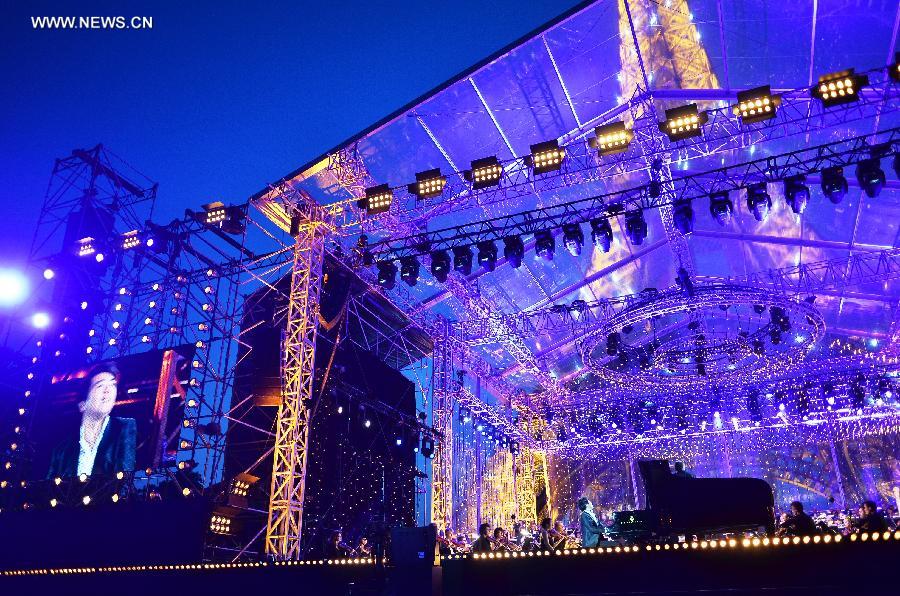 Chinese pianist Lang Lang plays piano during the national day concert held in Paris, France, on July 14, 2013. (Xinhua/Li Genxing)