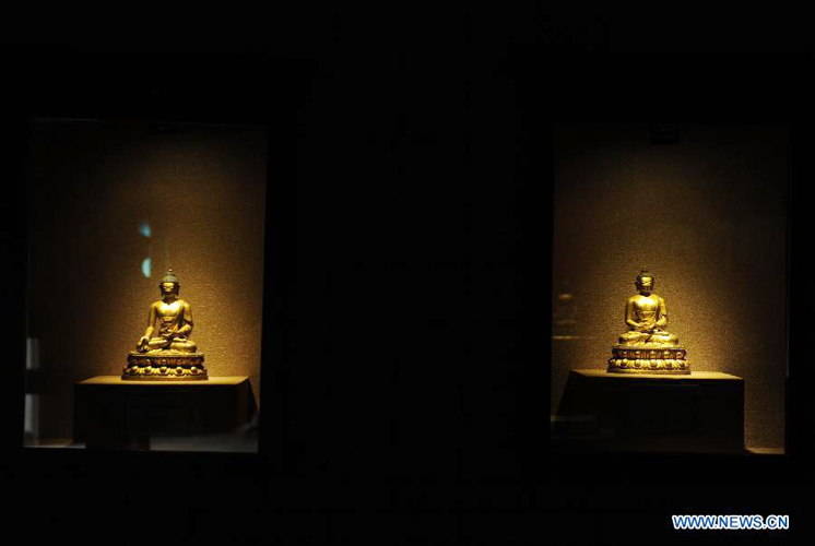 Buddhist statues are on display at the Bingling Temple Grottoes in Yongjing County, northwest China's Gansu Province, July 17, 2013. Listed as part of the ancient Silk Road for the World Heritage candidate, the grottoes will be reviewed by experts from U.N. Educational, Scientific and Cultural Organization after renovation of a giant Buddha statue dating back more than 1,000 years to the Tang Dynasty was completed lately. Bingling Temple Grottoes, filled with Buddhist statues, stupas and murals, were a work in progress between the 4th and 10th centuries. (Xinhua/Nie Jianjiang)