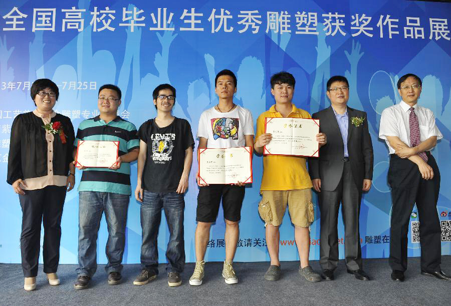 Honored guests and students win the honorable nominee awards pose for a group picture at the award ceremony of an exhibition of the awarded sculpture works of 2013 college graduates in Beijing, capital of China, July 21, 2013. These awarded works are presented to the public from July 21, 2013 to July 25, 2013 here. (Xinhua/Lu Peng)