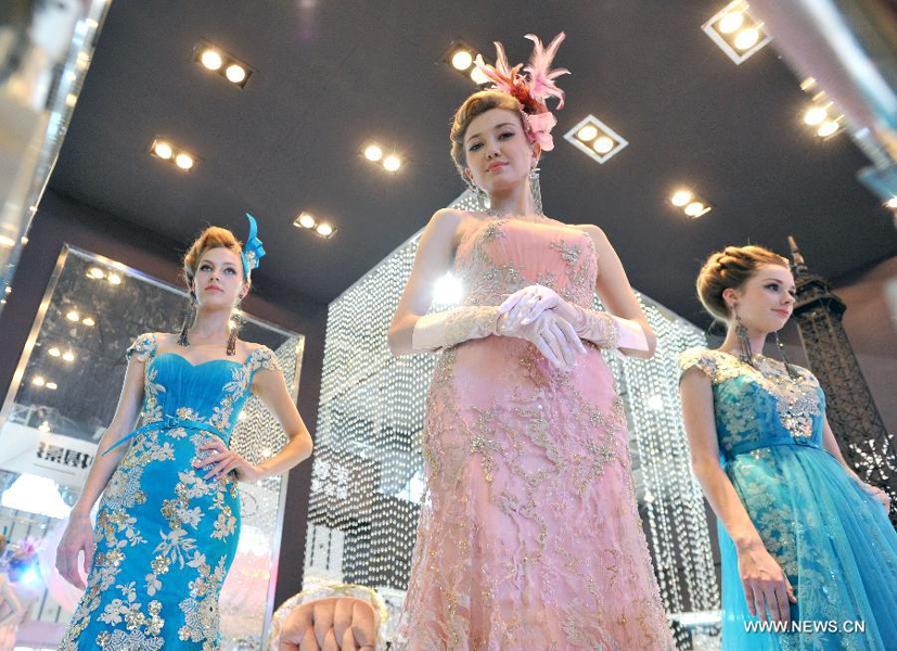 Models present wedding dresses during the wedding expo in Nanjing, capital of East China's Jiangsu province, Aug 10, 2013. [Photo/Xinhua]