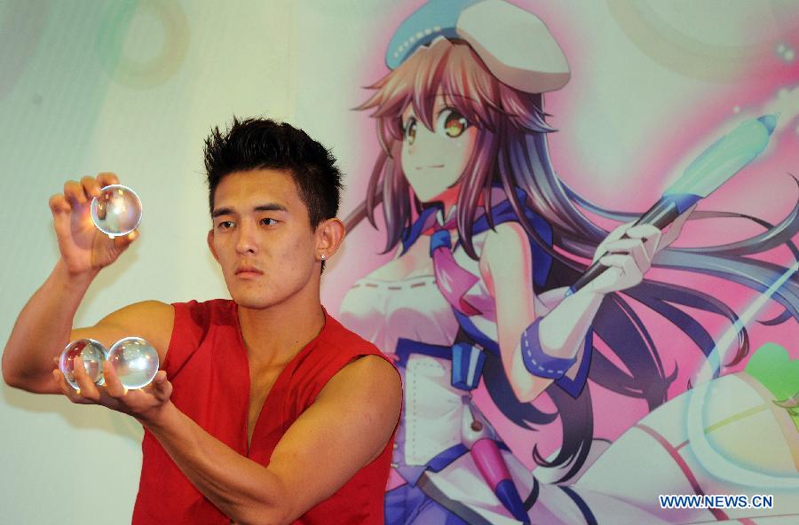 An artist performs during the 2013 Comic Exhibition in Taipei, southeast China's Taiwan, Aug. 15, 2013. The six-day event kicked off at the exhibition hall of Taipei World Trade Center on Thursday. (Xinhua/Tao Ming)