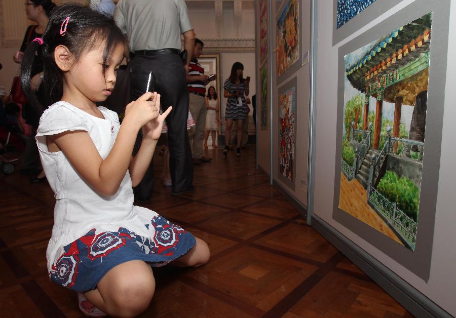 A girl takes photos at the 2013 Painting Exhibiton of Children from Japan, Korea and China, at the Children's Palace of the China Welfare Institute, east China's Shanghai, Aug. 17, 2013. [Xinhua/Liu Yin]