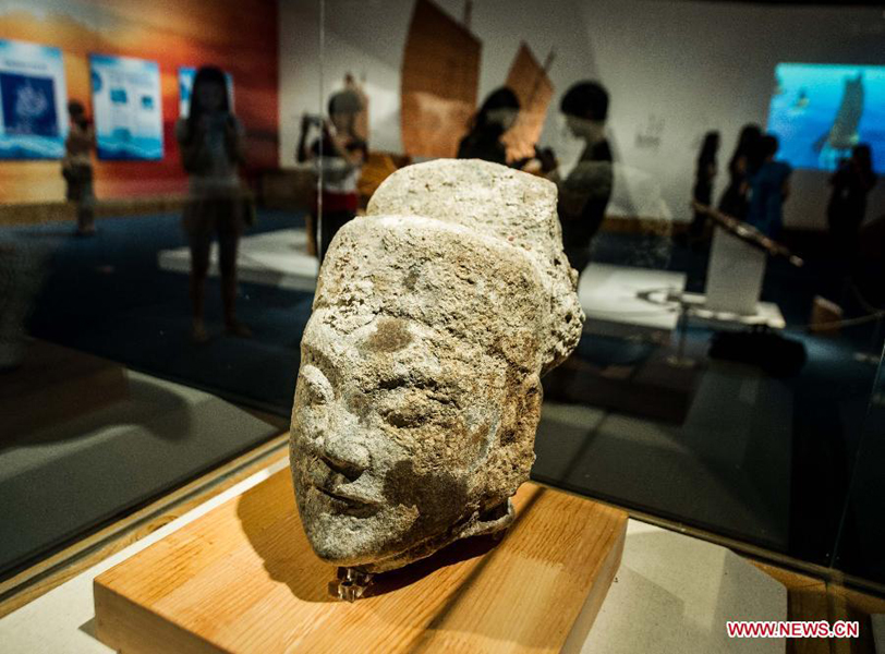 The head of a sculpture recovered from a shipwreck in the Xisha Islands in the South China Sea is on display at the Capital Museum in Beijing, capital of China, Aug. 22, 2013. An exhibition featuring some 280 findings from the shipwreck on Huaguang Reef No.1 opened Thursday at the museum. The wreck, dating back to the Southern Song Dynasty (1127-1279), was stumbled upon by a group of Chinese fishermen in 1996, three meters below sea water. (Xinhua/Luo Xiaoguang)