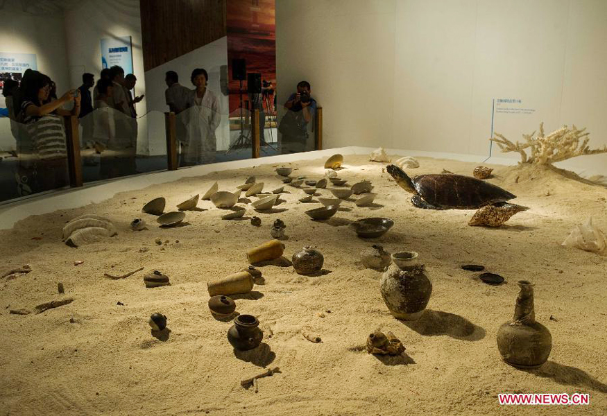Visitors view pieces of antique pottery and porcelain recovered from a shipwreck in the Xisha Islands in the South China Sea at the Capital Museum in Beijing, capital of China, Aug. 22, 2013. An exhibition featuring some 280 findings from the shipwreck on Huaguang Reef No.1 opened Thursday at the museum. The wreck, dating back to the Southern Song Dynasty (1127-1279), was stumbled upon by a group of Chinese fishermen in 1996, three meters below sea water. (Xinhua/Luo Xiaoguang)
