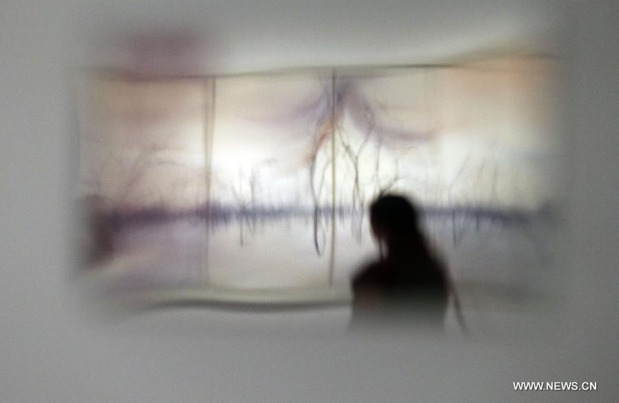 Photo taken on Aug. 26, 2013 shows the reflection of a visitor looking at an oil painting on canvas named "Clear Forest" in the National Art Museum of China [NAMOC] in Beijing, capital of China. The "Interactive Perspectives -- Contemporary Art Exhibition Across the Taiwan Straits 2013" kicked off at the NAMOC on Aug 26, showcasing works of 36 artists from both Chinese mainland and Taiwan. [Xinhua/Ren Zhenglai]