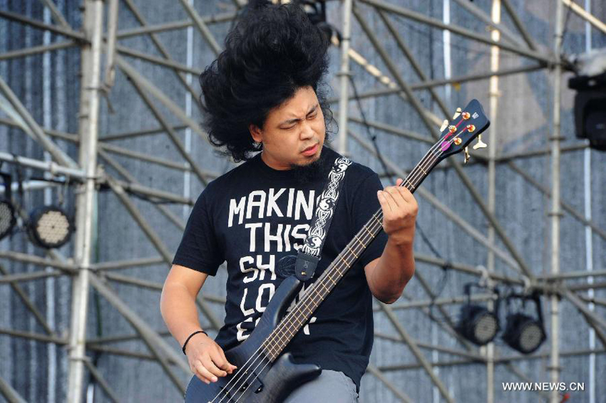 A member of the band CMCB performs during the 2nd Shandong (Qingdao) City Music Festival in Qingdao, east China's Shandong province, Aug. 25, 2013. The 2nd Shandong (Qingdao) City Music Festival opened here on Saturday. [Xinhua/Yu Fangping]