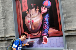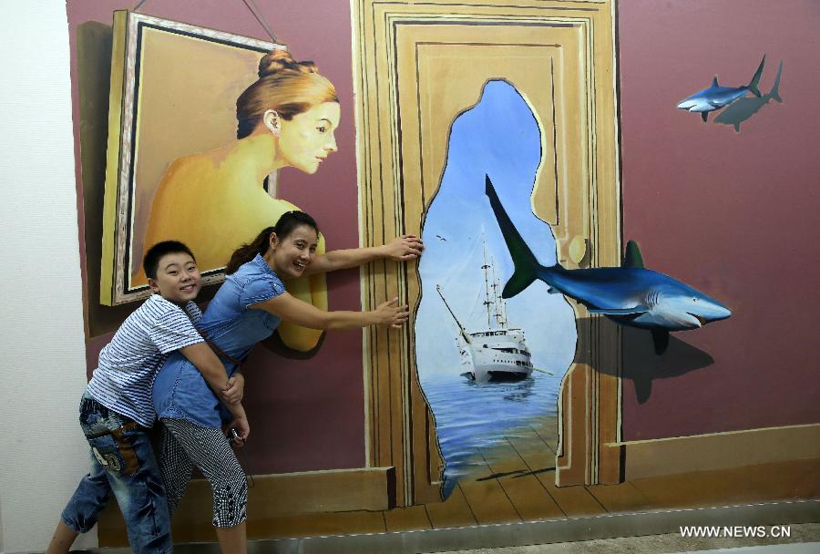 Visitors pose for a photo at a 3D painting exhibition in Xi'an, capital of northwest China's Shaanxi Province, Aug. 29, 2013. Some 40 pieces of 3D work were displayed in the exhibition which will last till Oct. 22. (Xinhua/Hou Zhi)