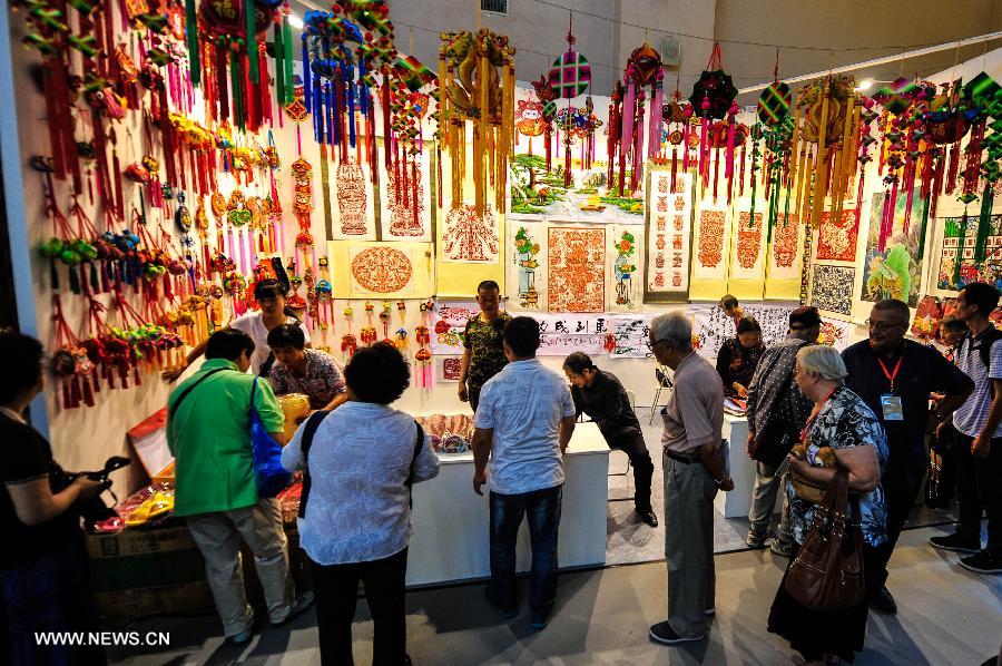 Visitors look at paper-cut artworks displayed at the 16th Beijing Art Expo in Beijing, capital of China, Sept. 13, 2013. Over 5,000 pieces of artworks from 20 countries and regions will be on display in the four-day expo which kicked off on September 13. [Xinhua/Zhang Xun]