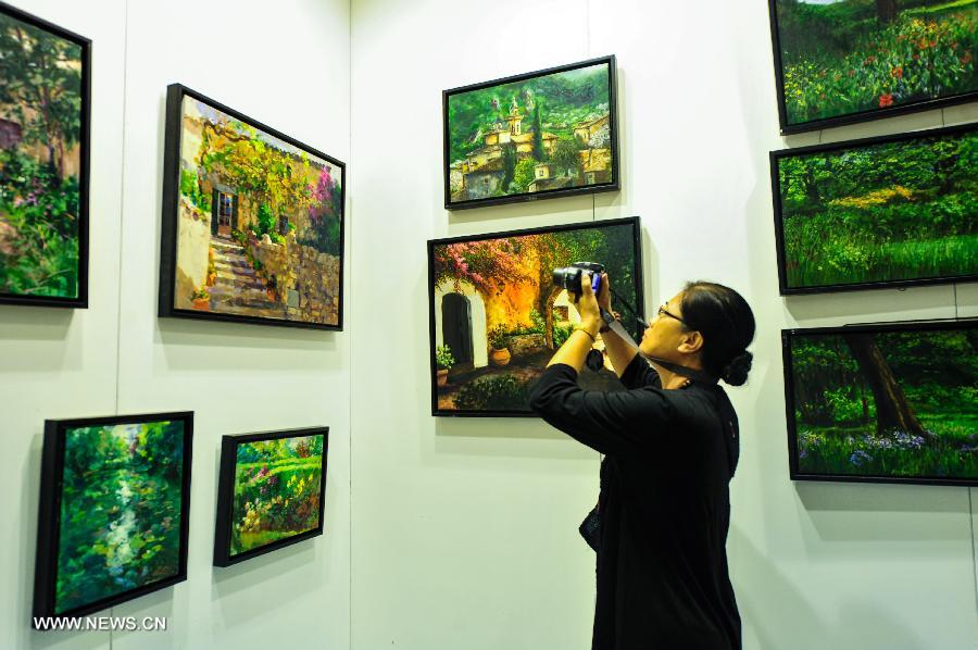 A visitor takes photo of paintings displayed at the 16th Beijing Art Expo in Beijing, capital of China, Sept. 13, 2013. Over 5,000 pieces of artworks from 20 countries and regions will be on display in the four-day expo which kicked off on September 13. [Xinhua/Zhang Xun]
