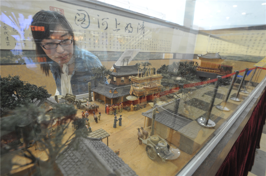 Visitors enjoy a 3-D version of the famous ancient painting 'Riverside Scene at the Qingming Festival' in Shenyang, Liaoning province, September 13, 2013. The piece was created by folk artist Yu Qiquan, in accordance with the original 6-meter-long painting. It took the artist one year to finish it, and he wants to present the art skill as an intangible cultural heritage to the world.[Photo by Sun Hai/Asianewsphoto]