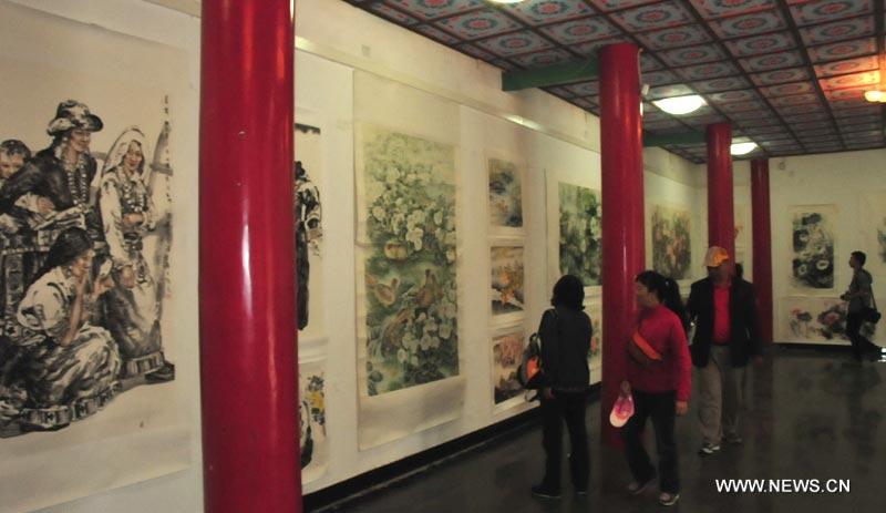 Photo taken on Sept. 17, 2013 shows people visiting a Chinese painting exhibition in Yinchuan, capital of northwest China's Ningxia Hui Autonomous Region. (Xinhuanet) |